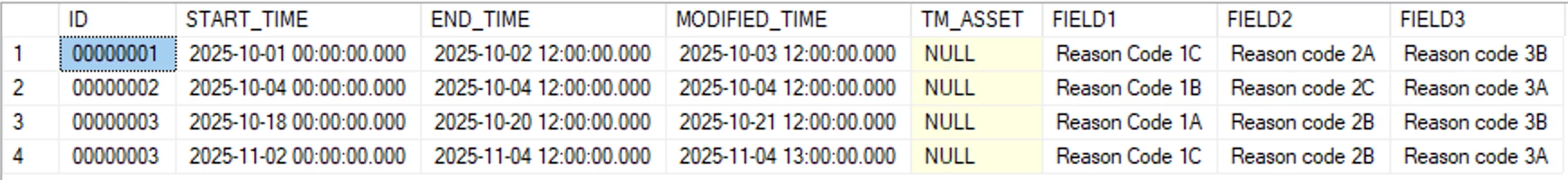 This query retrieves events from your source database within a specified time range. TrendMiner uses a streaming event approach, so that open context events (e.g. an ongoing OEE loss or batch record) can be created as soon as it begins, and each subsequent state can be ingested right away. If you have a flat table where each row corresponds to exactly 1 context item, and the states are distributed in the columns instead, some data processing may be required.