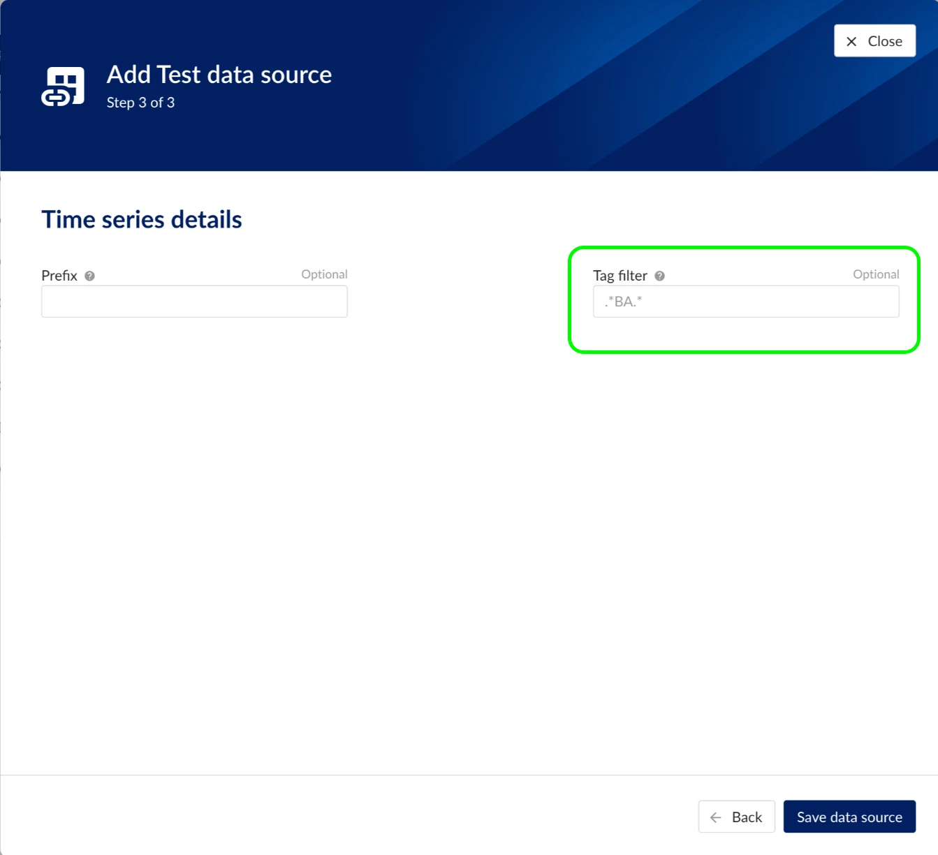 Tag filters can be added when creating or editing a datasource: