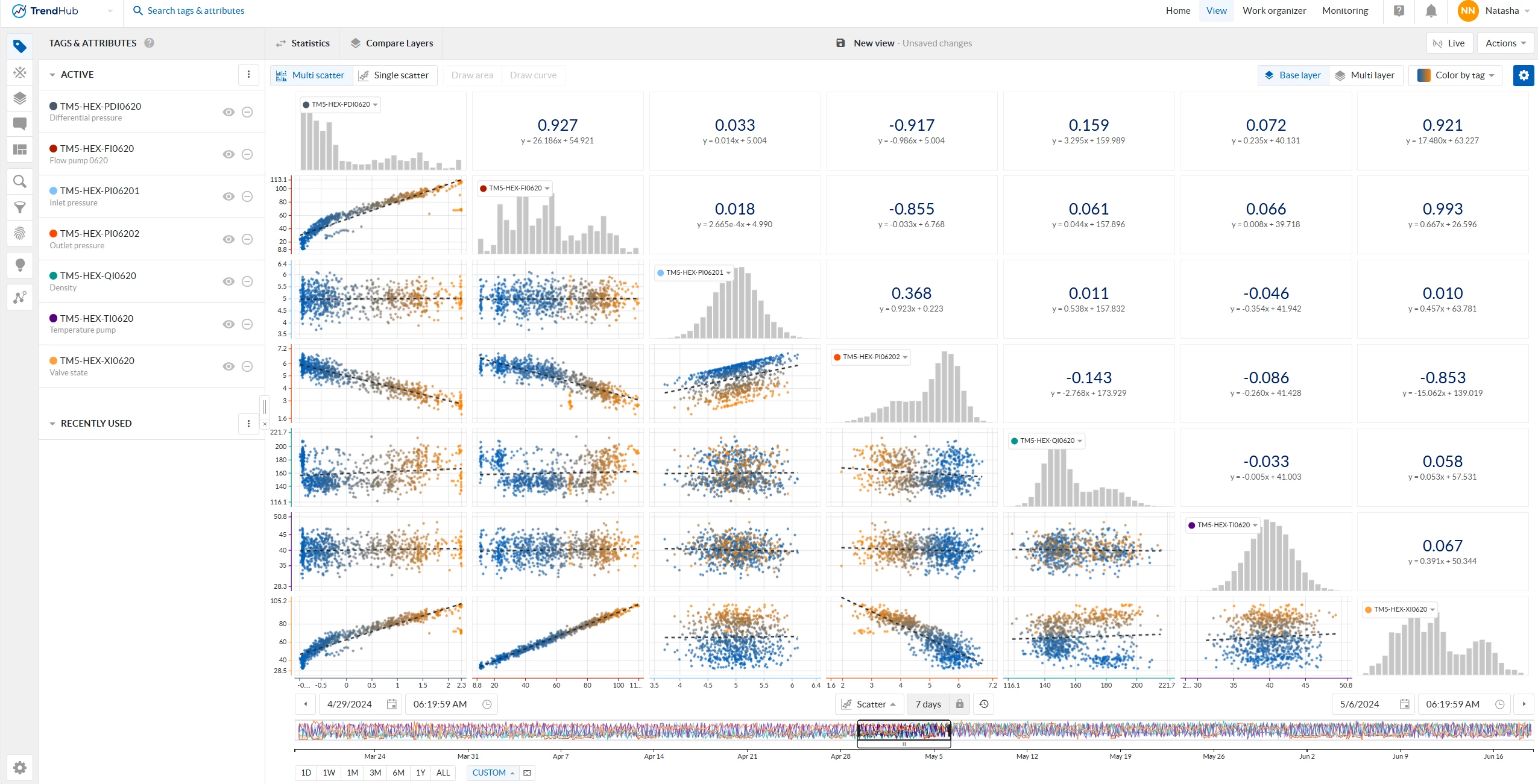 In the Multi scatter view, all visible tags from your active tag list are plotted against each other. Each combination generates a scatter plot, accompanied by histograms and a regression line (initially linear), including its regression coefficient.