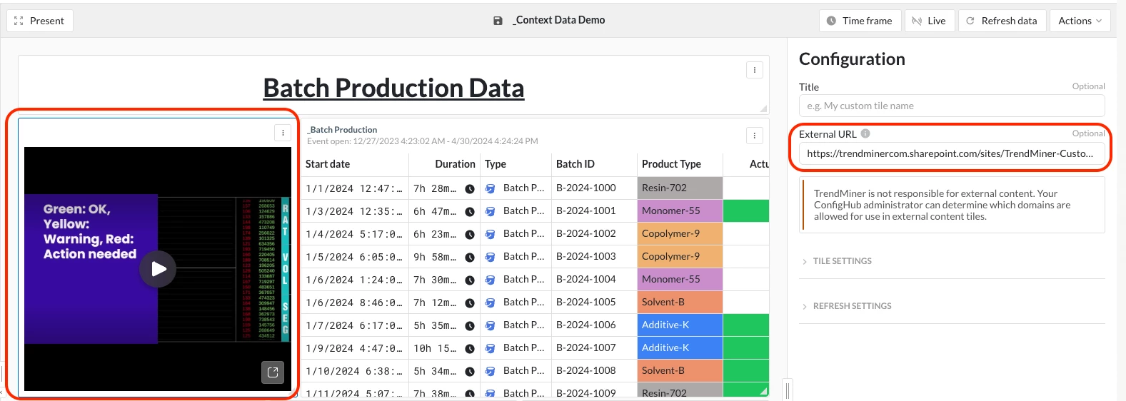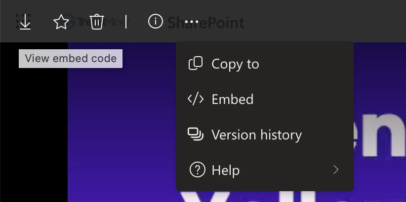 Preview your video in SharePoint to get the iframe source URL, then embed it as an external content tile in TrendMiner.