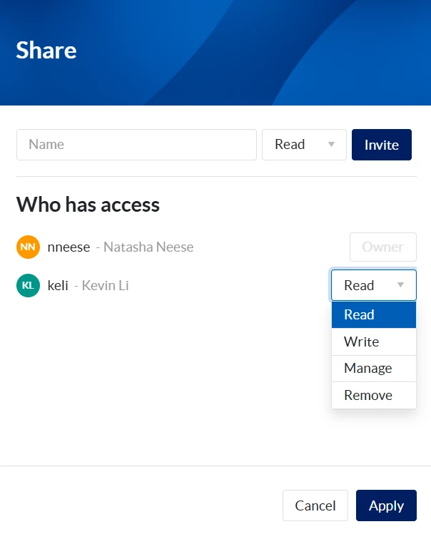 Manage Permission: Owners can now delegate management responsibilities by granting "Manage" permission. This allows colleagues to co-manage shared content, maintain folders, and even share resources on your behalf.