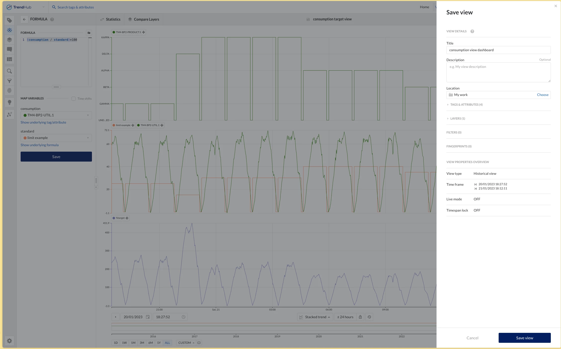 Which trendminer feature is able to compare current consumption at product type xy vs. standard consumption at the same product type? I would like to have a Dashboard showing standard consumption vs. current consumption and a green, yellow, red flag (depending on %-value of lower / higher consumption vs. standard).